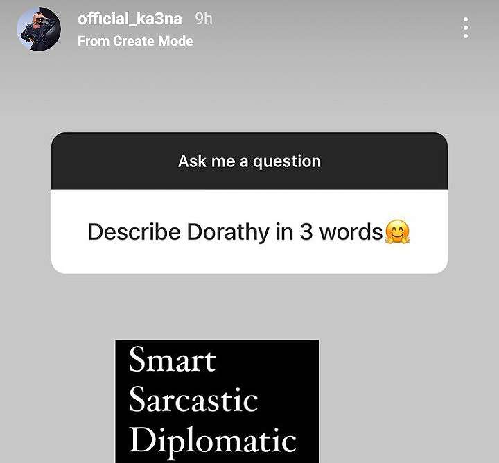 And Ka3na replied saying that Dorathy is Smart, Sarcastic and Diplomatic…. “Smart, Sarcastic, Diplomatic,” Ka3na responded.