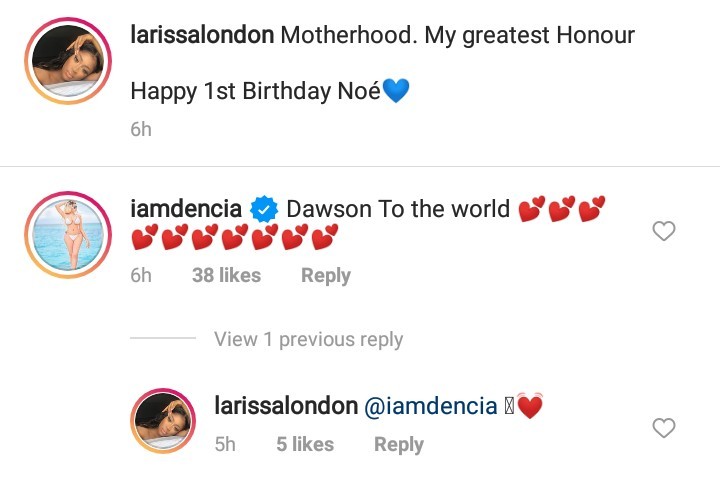 She captioned her post; “Motherhood. My greatest Honour. Happy 1st Birthday Noé💙”, with comment from a user @iamdencia saying, “Dawson to the world.”