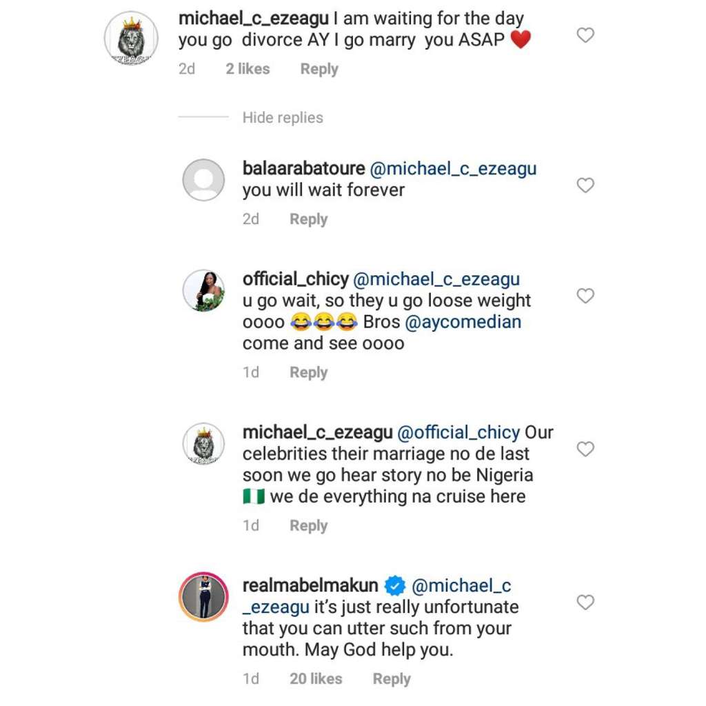 The user Michael (@michael_c_ezeagu) commented saying that he’s waiting for the day Mabel would divorce AY so he can marry her as soon as possible.