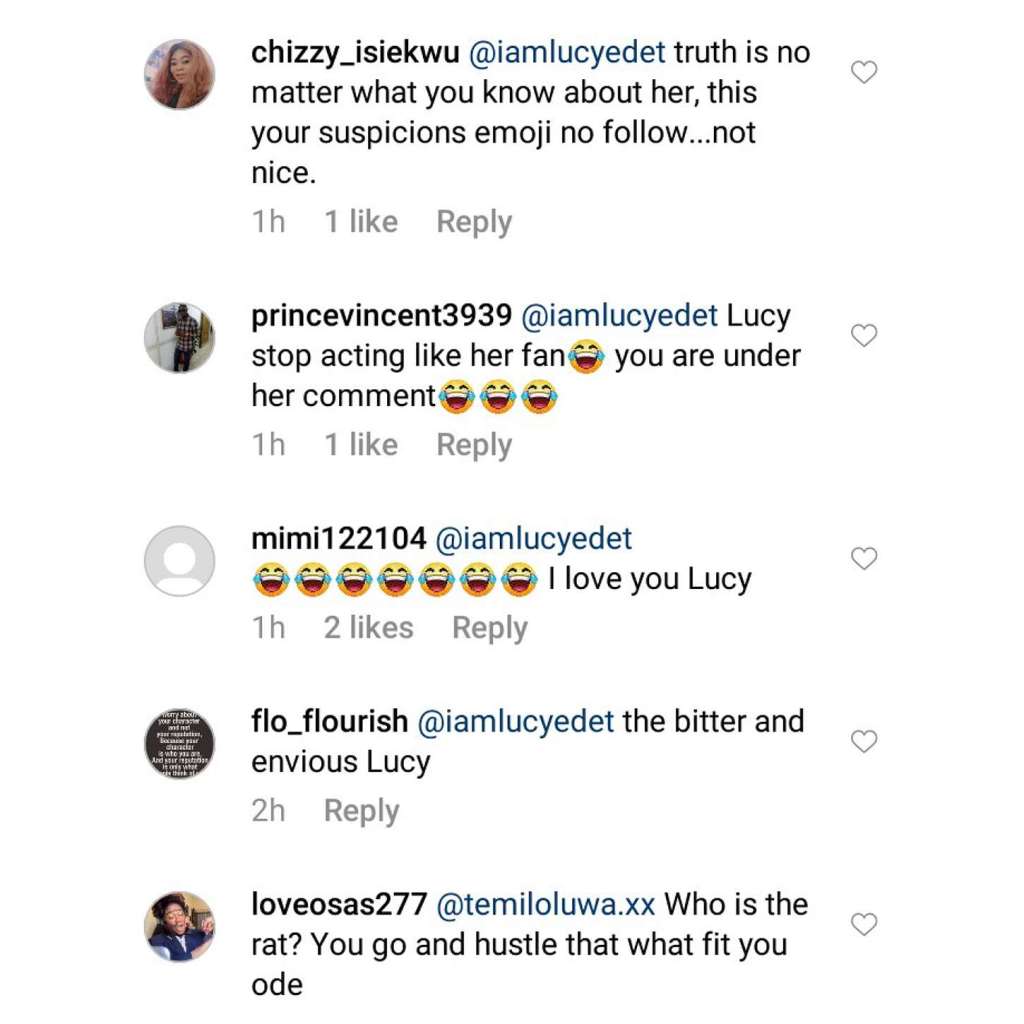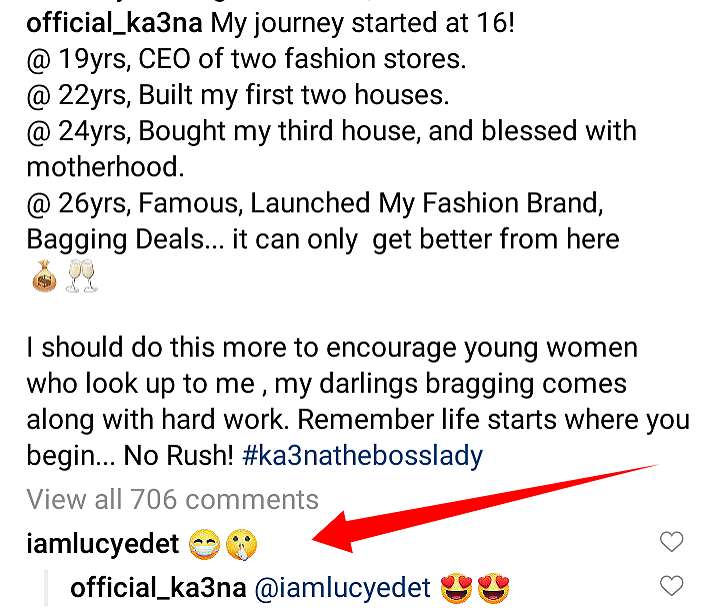 Besides, Lucy has cleared air on reason she posted the emojis and according to her, she shared them on Ka3na comment section because she (Ka3na) told people that she doesn’t care what they’ll say about her list of achievements.