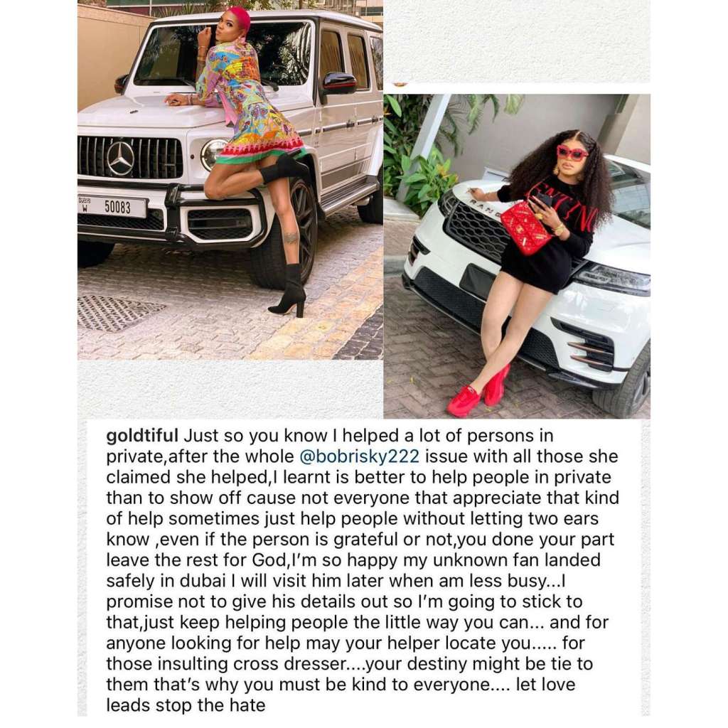 “I’m so happy my unknown fan landed safely in dubai I will visit him later when am less busy… I promise not to give his details out so l’m going to stick to that, just keep helping people the little way you can… and for anyone looking for help may your helper locate you… for those insulting cross dresser… your destiny might be tie to them that’s why you must be kind to everyone… let love leads stop the hate.”