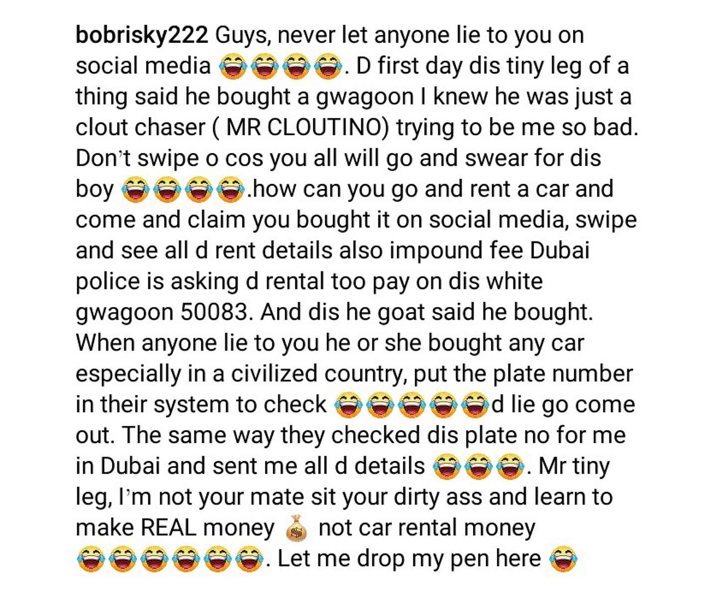 “When anyone lie to you he or she bought any car especially in a civilized country, put the plate number in their system to check 😂😂😂😂😂d lie go come out. The same way they checked dis plate no for me in Dubai and sent me all d details 😂😂😂. Mr tiny leg, I’m not your mate sit your dirty a*s and learn to make REAL money 💰 not car rental money 😂😂😂😂😂😂. Let me drop my pen here 😂 ”