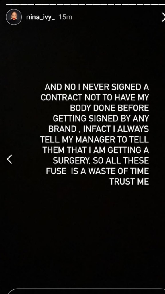 “AND NO I NEVER SIGNED A CONTRACT NOT TO HAVE MY BODY DONE BEFORE GETTING SIGNED BY ANY BRAND. IN FACT I ALWAYS TELL MY MANAGER TO TELL THEM THAT I AM GETTING A SURGERY. SO ALL THESE FUSS IS A WASTE OF TIME TRUST ME,” Nina wrote in one of her Instastory posts.