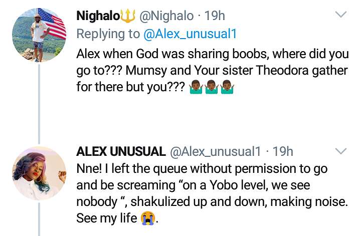 However, a Twitter user identified as Nighalo came asking Alex where she was when God was sharing bo*bs, adding that her mom and sister Theodora have themselves endowed with nice milks.