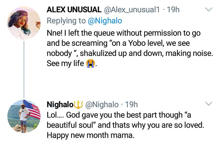 “Nne! I left the queue without permission to go and be screaming “on a Yobo level, we see nobody “, shakulized up and down, making noise. See my life 😭,” Alex replied Nighalo.