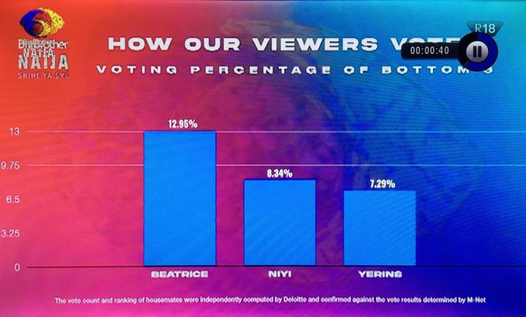However, Yerins polled the lowest vote in the voting chart, followed by Niyi and lastly the first female evicted Housemate Beatrice.