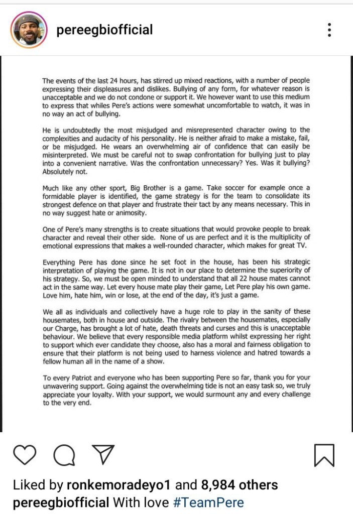 “Everything Pere has done since he set foot in the House, has been his strategic interpretation of playing the game. It is not in our place to determine the superiority of his strategy. So, we must be open minded to understand that all 22 house mates cannot act in the same way. Let every house mate play their game, Let Pere play his own game. Love him, hate him, win or lose, at the end of the day, it’s just a game.