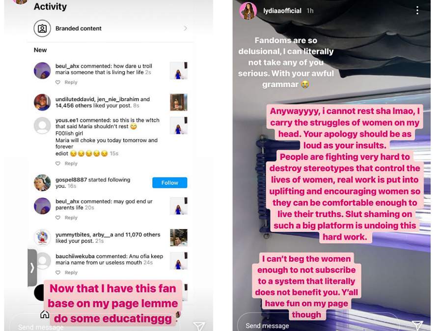 • Lydia responded to reactions from Maria’s supporters, stating that fandoms of most Big Brother Naija stars are delusional, as many of them see everything that their fave does as right.