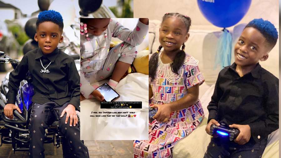 Tiwa Savage’s son, Jamil Balogun, aka Jam Jam has been captured speaking with Imade Aurora Adeleke, daughter of singer Davido, on phone.