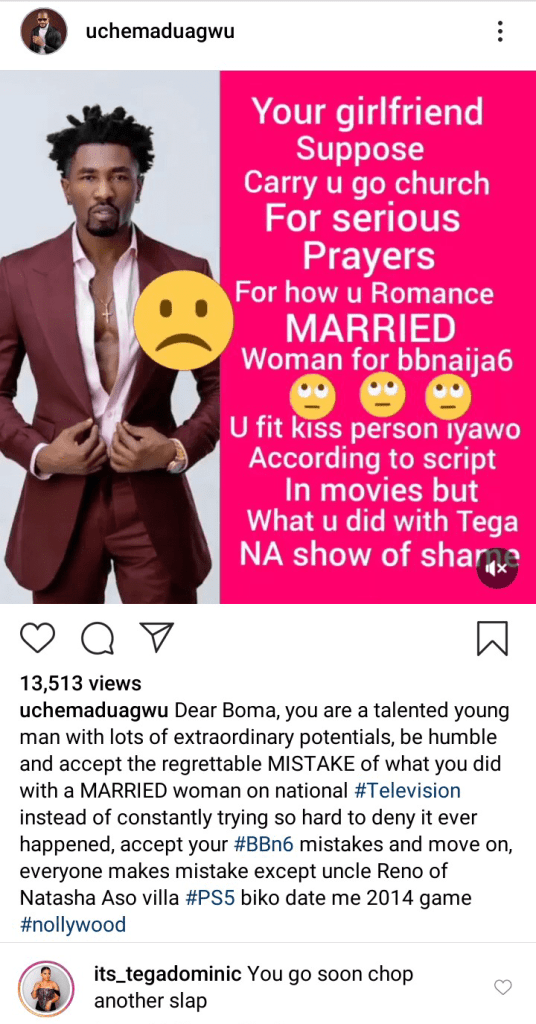 Tega did this after social critic, Uche Maduagwu tackled Boma in a post, where he advised him to accept the mistake he made in the Big Brother Naija House.