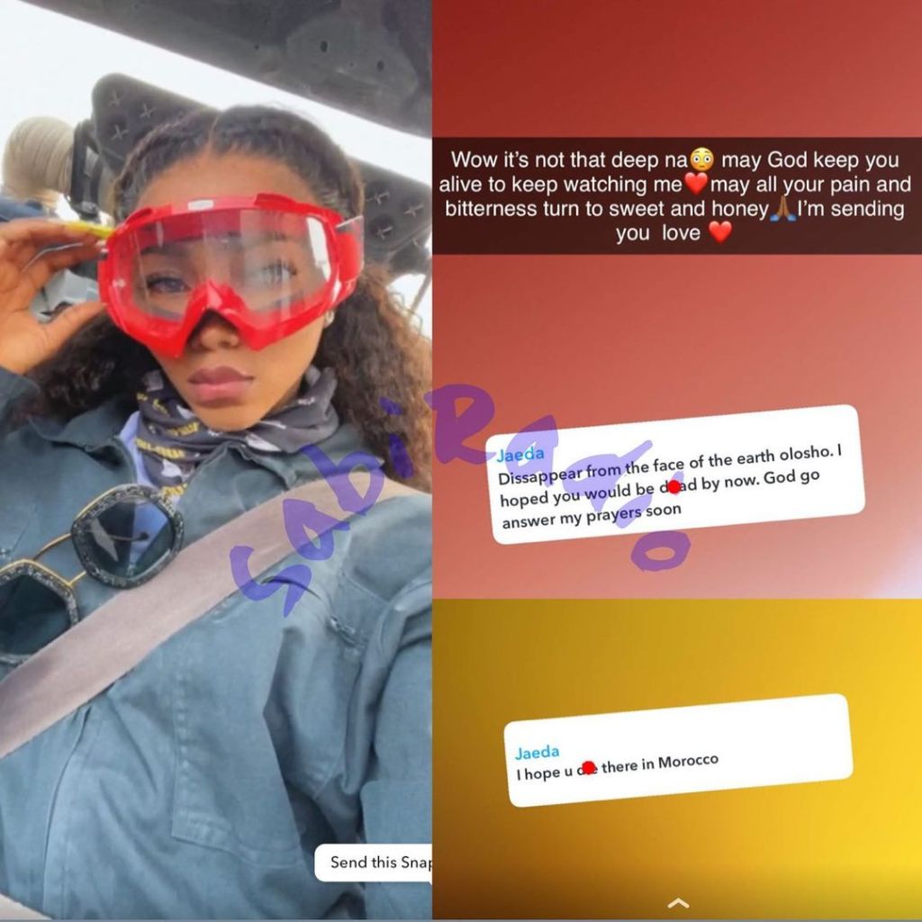 “Dissappear from the face of the earth olosho. hoped you would be dead by now. God go answer my prayers soon. I hope u die there in Morocco,” Jaeda’s comment read.