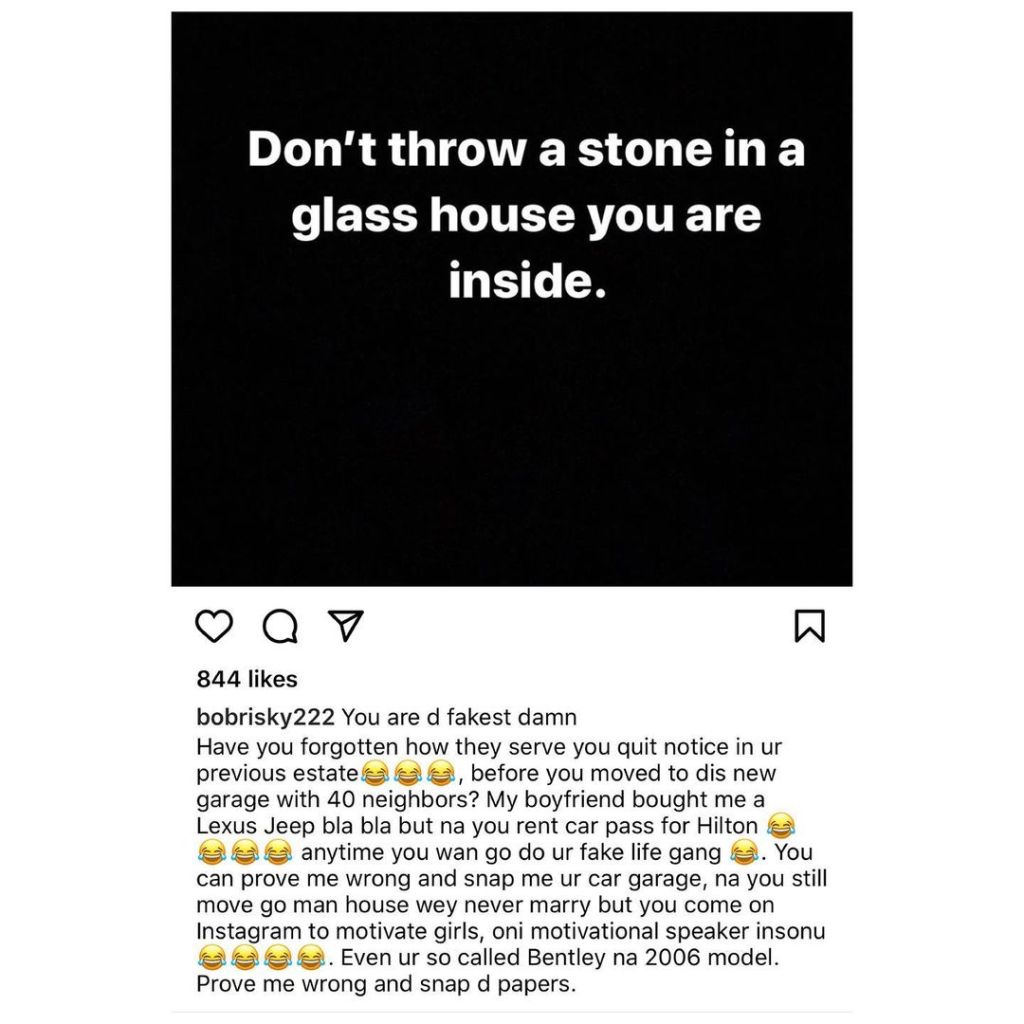 “My boyfriend bought me a Lexus Jeep bla bla but na you rent car pass for Hilton anytime you wan go do ur fake life gang. You can prove me wrong and snap me ur car garage, na you still move go man house wey never marry but you come on Instagram to motivate girls, oni motivational speaker insonu. Even ur so called Bentley na 2006 model. Prove me wrong and snap d papers.”