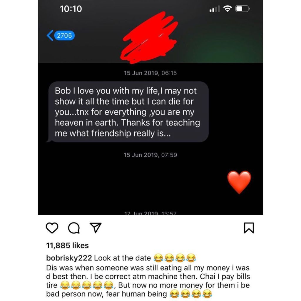 Bobrisky continued in a new post, where he posted a screenshot, showing the period Tonto Dikeh showered enormous praises on him, because of how he spends on her, adding that she’s now out to troll him because they’re no more friends.