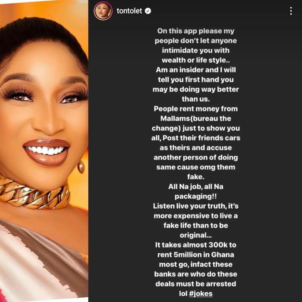In a random post made by Tonto on Thursday, December 16, she revealed how some Nigerian celebrities she knows, go as far as meeting Mallams or Bureau De Change operators to hire or rent huge sum of money, in order to show off.