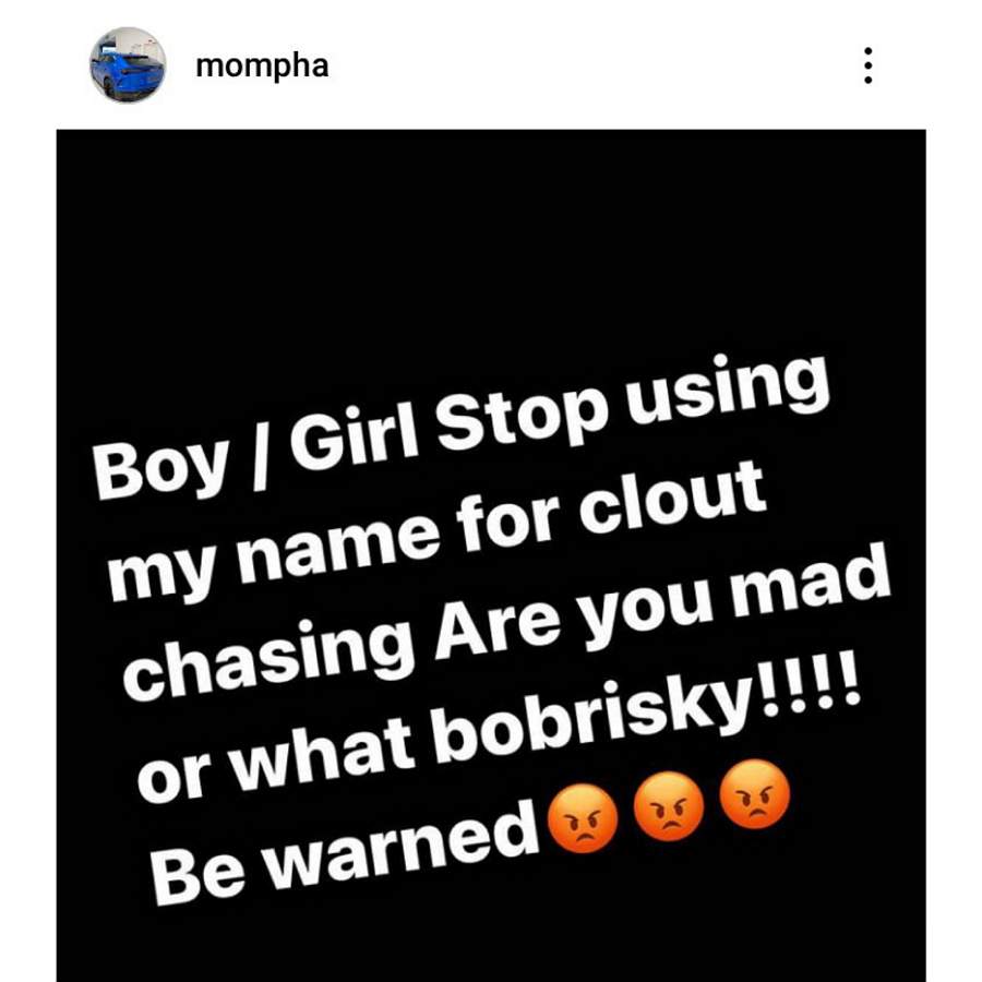 Mompha’s statement read, “Boy/Girl Stop using my name for clout chasing Are you mad or what bobrisky!! Be warned.