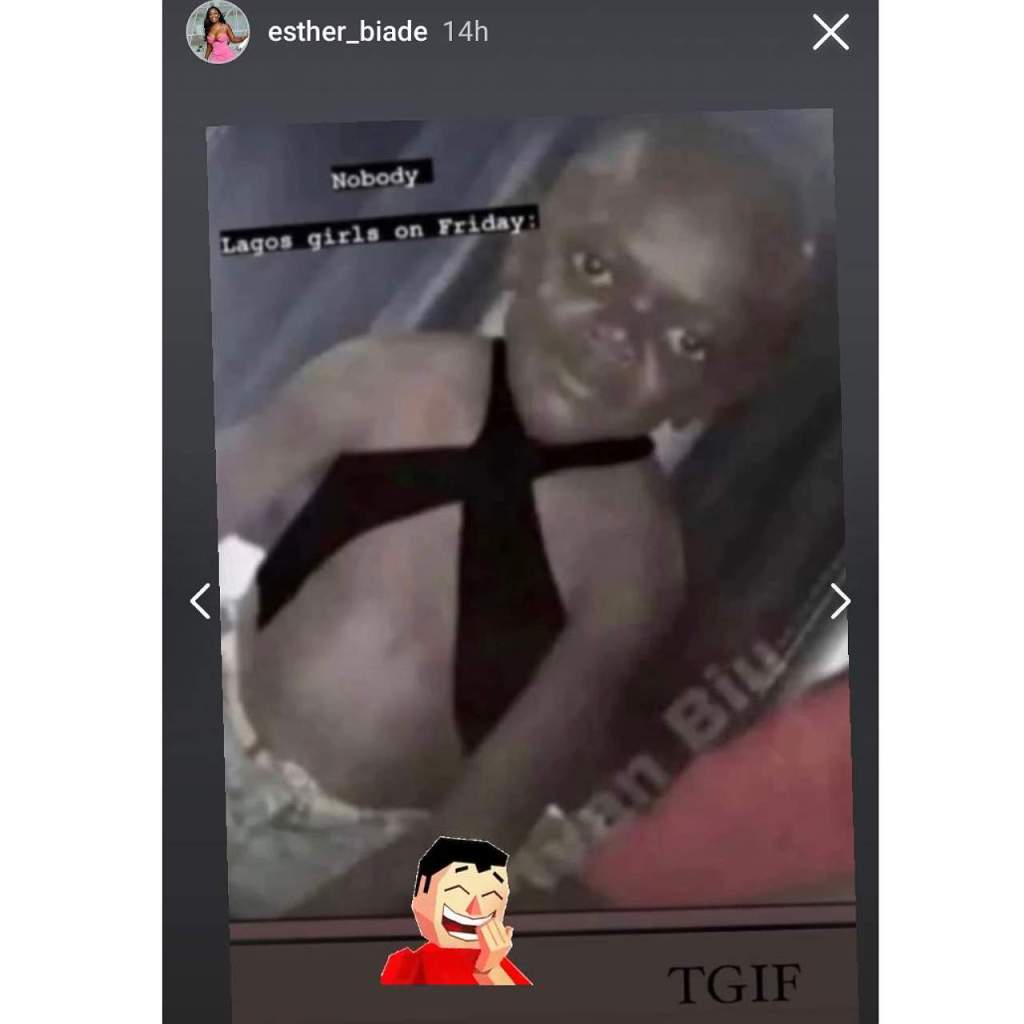 • Esther shaded Angel with a meme, describing how her dress looks, adding that it’s what Lagos ladies wear to clubs on Friday nights.