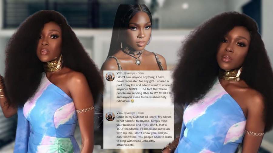 Vee tweeted, “I don’t owe anyone anything. I have never requested for any gift. I shared a part of my life and I don’t want to share it anymore SIMPLE. The fact that these people are sending DMs to MY MOTHER and anyone close to me is absolutely ridiculous.