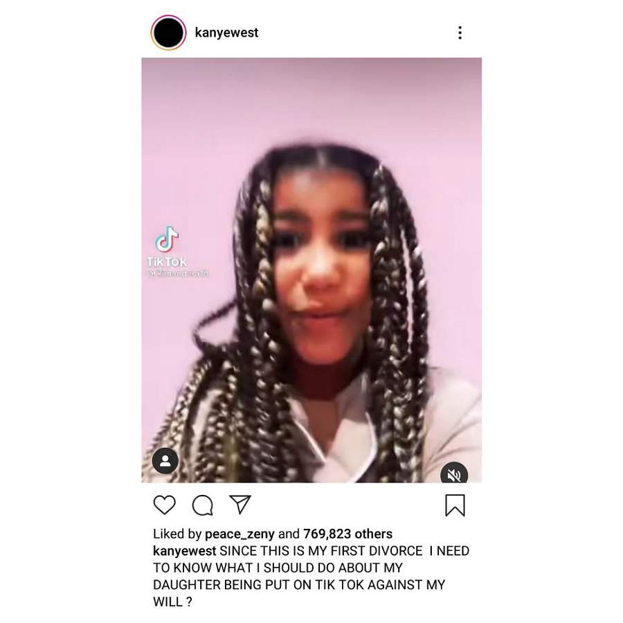 Sharing a screenshot via his Instagram page, Kanye asked why it’s now he had his first divorce that his daughter was being put on Tik Tok against his will.