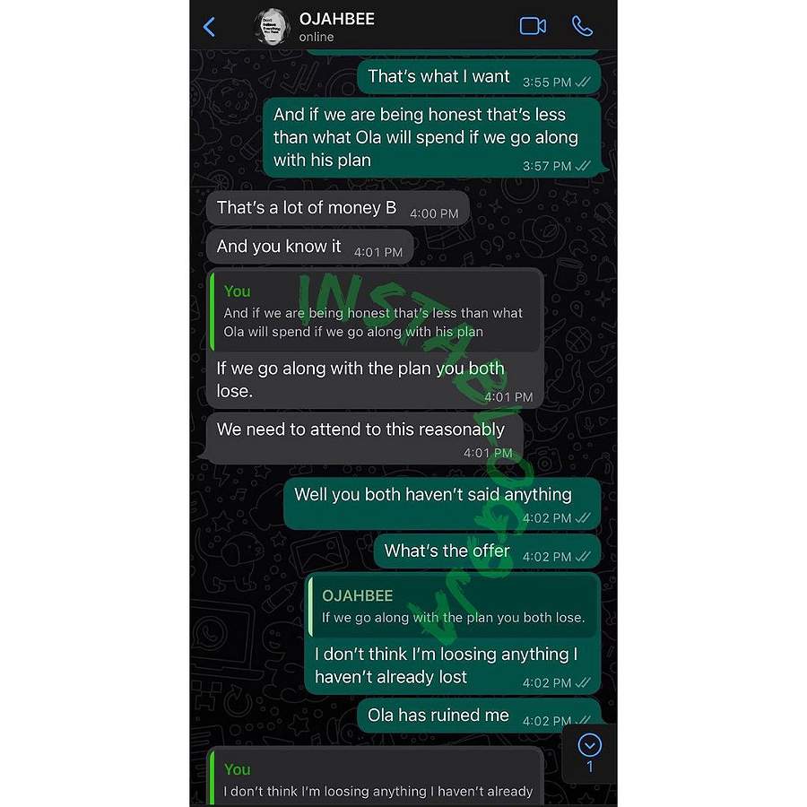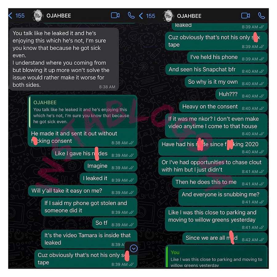 Ojahbee advised Tamara in the chat to calm down, as Oxlade is equally still recovering from traumatic experience emanating from the released tape, besides, her demand seems huge for Oxlade.