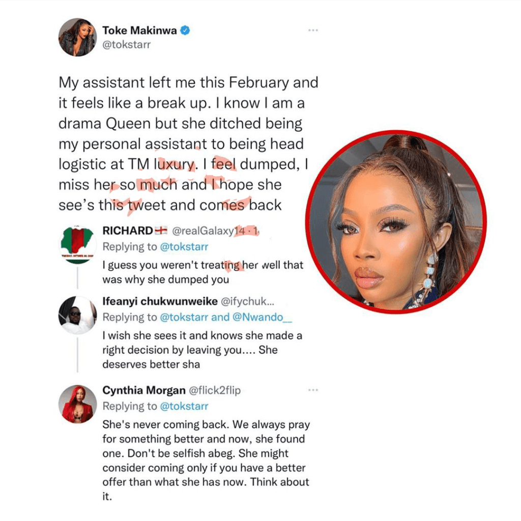 Toke further revealed that before leaving, her personal assistant was ditched being her assistant to head of logistics at Toke Makinwa Luxury.