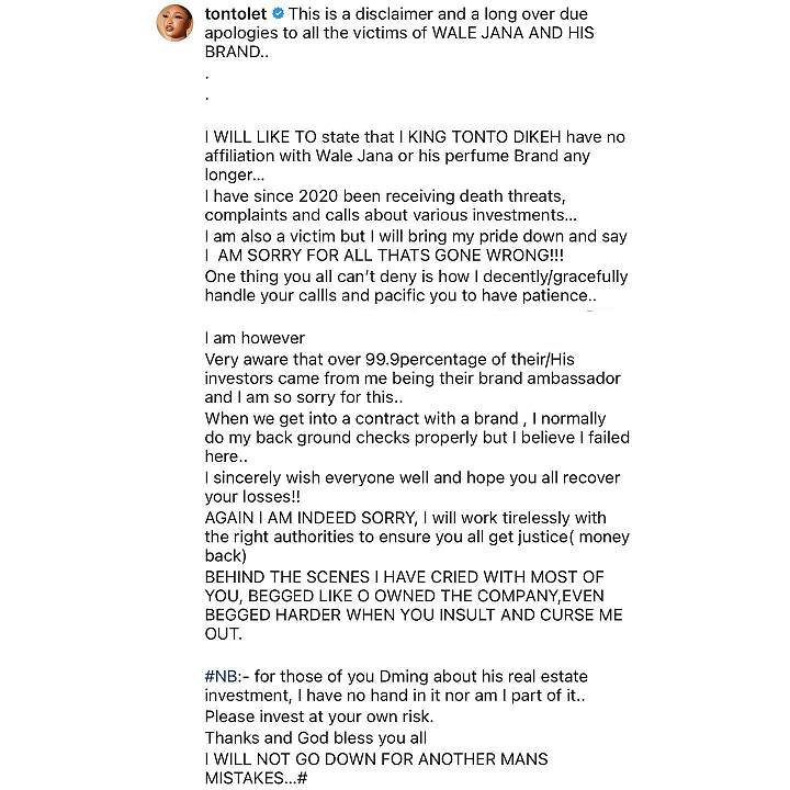 Tonto’s statement read, “This is a disclaimer and a long over due apologies to all the victims of WALE JANA AND HIS BRAND.. I WILL LIKE TO state that I KING TONTO DIKEH have no affiliation with Wale Jana or his perfume Brand any longer..