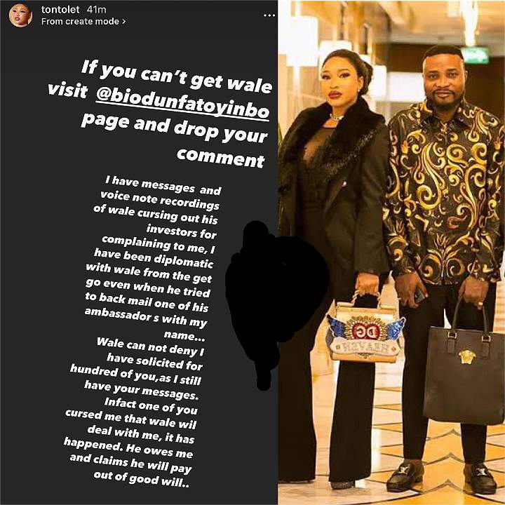 She also beckoned on those who have been sending her direct messages and death threats to stop, as she has tried her best responding to some of them. Tonto also advised anyone of the company’s victim who can’t reach Wale Jana to send his friend and pastor Biodun Fatoyinbo a message via his Instagram page.