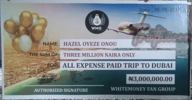 Nigerian Big Brother Naija season 6 Shine Ya Eye show winner, Hazel Oyeze Onoduenyi popularly known as Whitemoney has been gifted N37 million and N3 million all-expense-paid trip to Dubai.