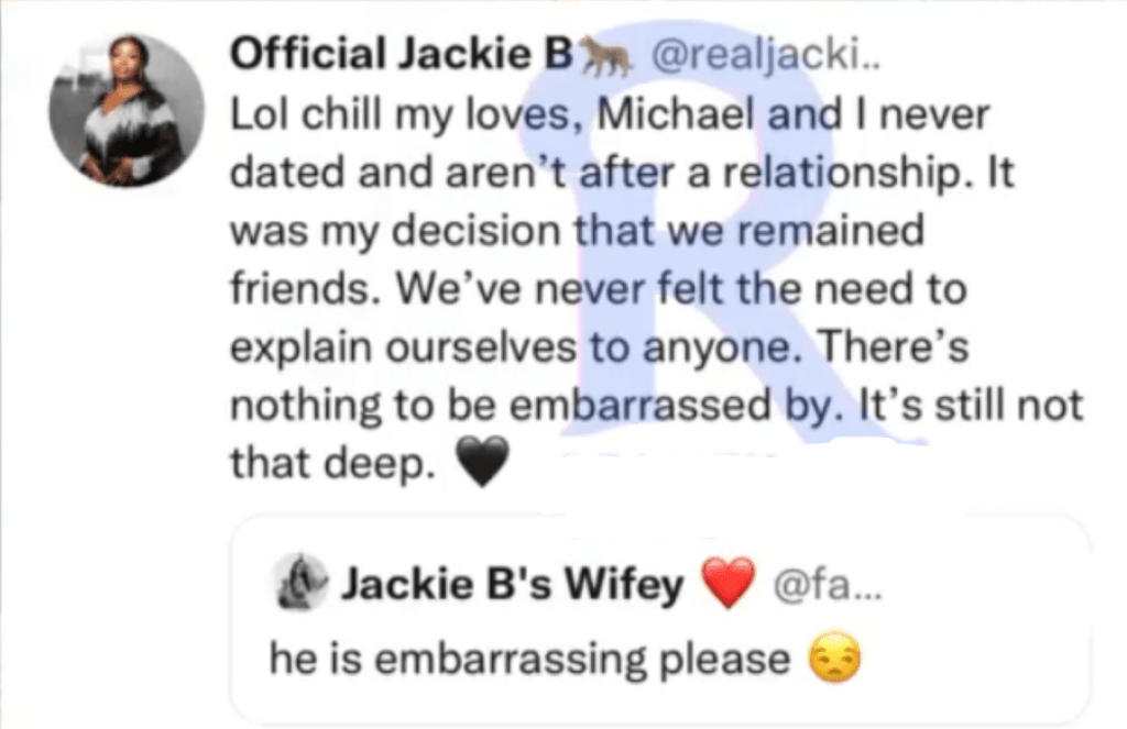 • Jackie B had noted in a now-deleted tweet that she and Michael never dated, adding that they were just friends, and agreed to remain as such.