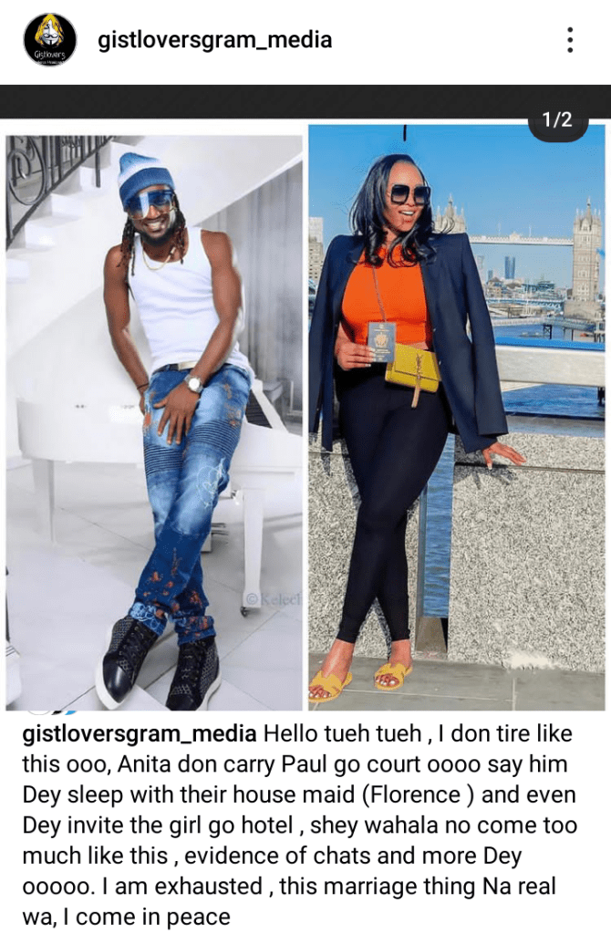 “Hello tueh tueh , I don tire like this ooo, Anita don carry Paul go court oooo say him Dey sleep with their house maid (Florence ) and even Dey invite the girl go hotel , shey wahala no come too much like this , evidence of chats and more Dey ooooo. I am exhausted, this marriage thing Na real wa, I come in peace.”