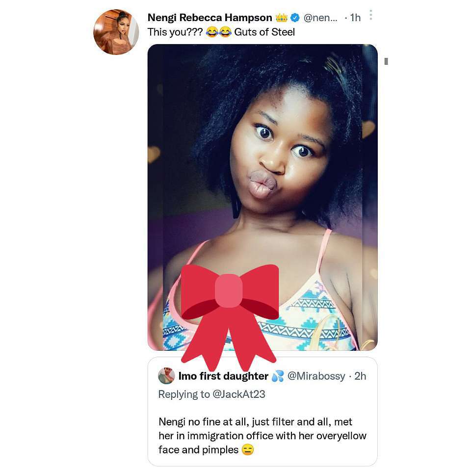 The Twitter user identified as Mirabossy took to the platform to shade Nengi as she flaws her beauty, saying her overyellow face is full of pimples.