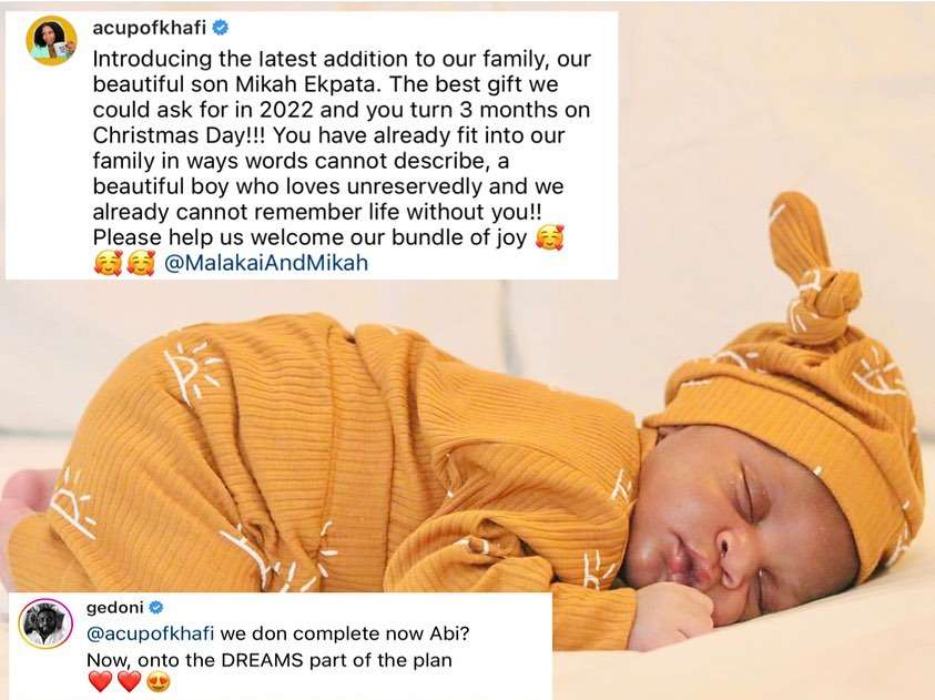 She wrote, “Introducing the latest addition to our family, our beautiful son Mikah Ekpata. The best gift we could ask for in 2022 and you turn 3 months on Christmas Day!!!