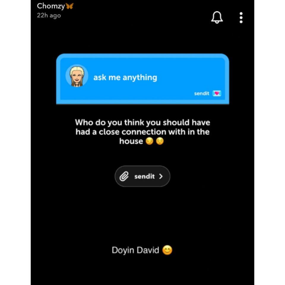 A supporter asked Chomzy who among her co-housemates she should have had close connection with in the Biggie’s House, and she simply replied, “Doyin David”.
