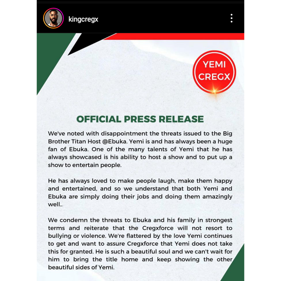 The management of the Big Brother Titans season 1 Ziyakhala Wahala Housemate Yemi Cregx has released official statement after one of his supporters publicly sent out death threat to Ebuka and his family, following the outcome of last Sunday’s eviction.