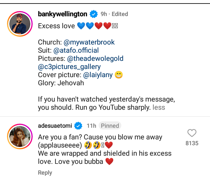 In response to his post, Banky’s wife Adesua Etomi took to his comment section and penned, “Are you a fan? Cause you blow me away (applauseeee). We are wrapped and shielded in his excess love. Love you bubba”.