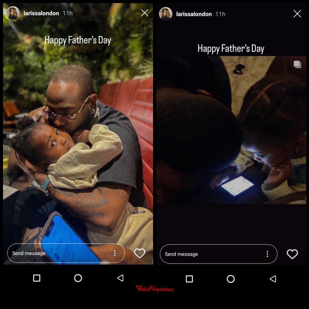 On sharing the pictures, Larissa inscribed them with Happy Father’s Day, as Davido was spotted in one of the pictures pecking his children on the cheek and on the second one, glancing through the phone together.