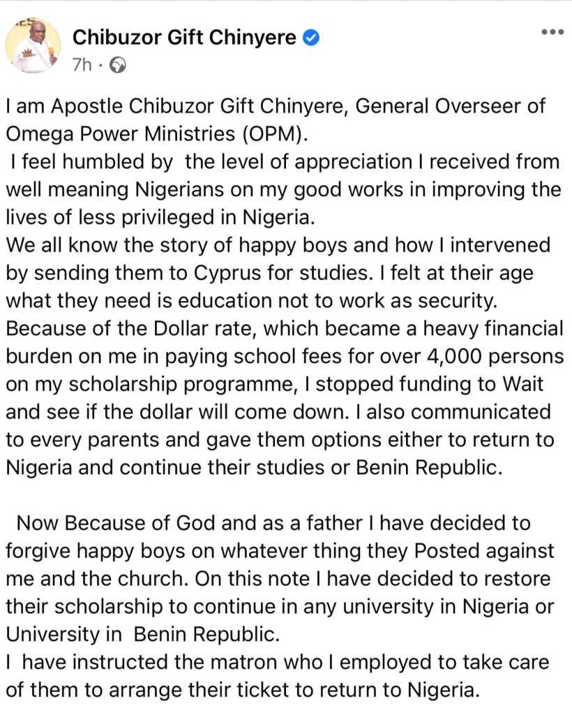 “Now Because of God and as a father I have decided to forgive happy boys on whatever thing they Posted against me and the church. On this note I have decided to restore their scholarship to continue in any university in Nigeria or University in Benin Republic.