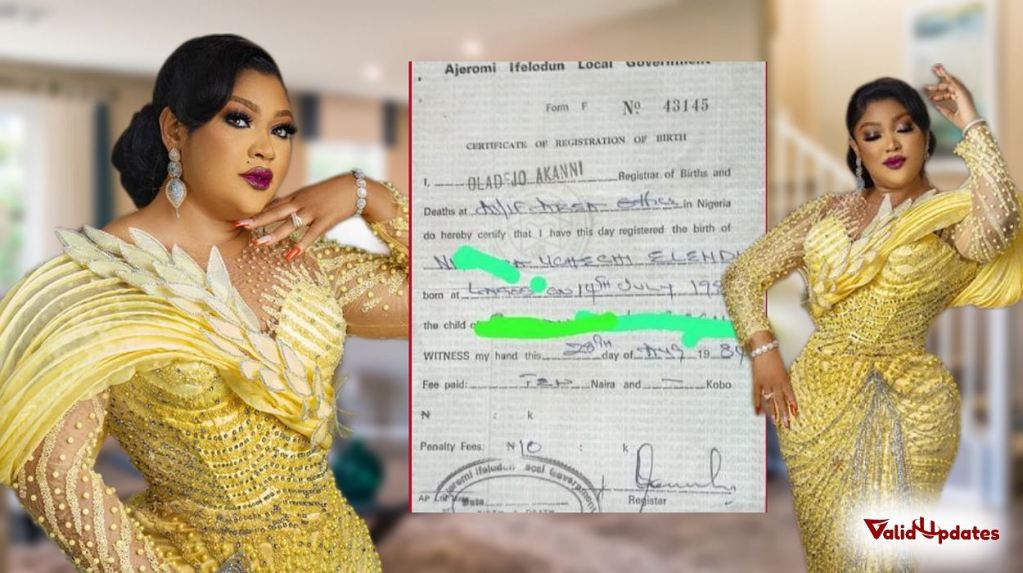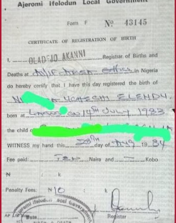 “The certificate of declaration of Birth which was done on August 29, 1984 shows the actress Uchechi Elendu was born on July 14, 1983, and a fee of N10 was paid for it.”