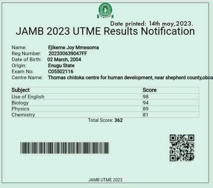 Mmesoma claims her “results notification” slip for the Unified Tertiary Matriculation Examination showing a score of 362 out of 400 was printed from the JAMB results portal, but the board argues she is parading a forged result on a template it discontinued in 2021.
