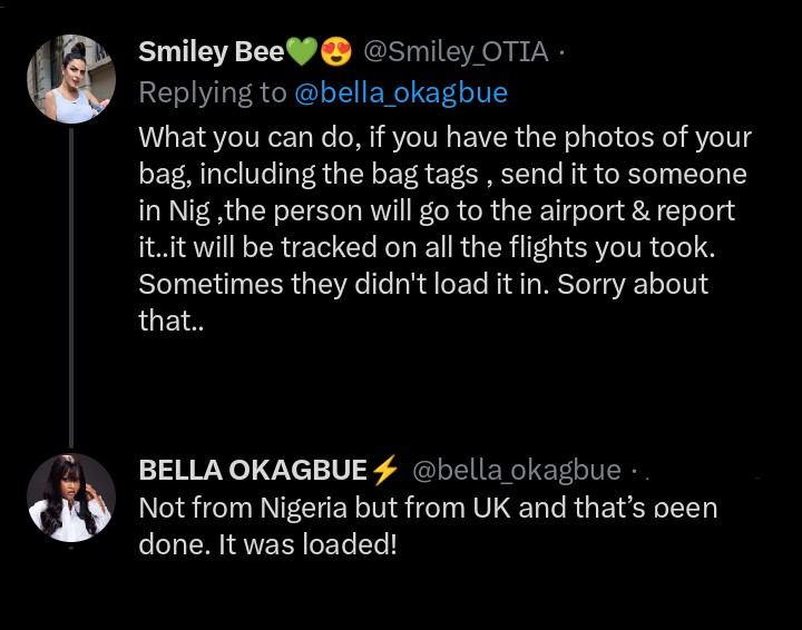The follower’s advice reads, “What you can do, if you have the photos of your bag, including the bag tags , send it to someone in Nig, the person will go to the airport & report it..it will be tracked on all the flights you took. Sometimes they didn’t load it in. Sorry about that..”
