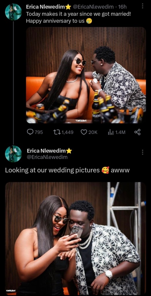 “Today makes it a year since we got married! Happy anniversary to us,” Erica tweeted.