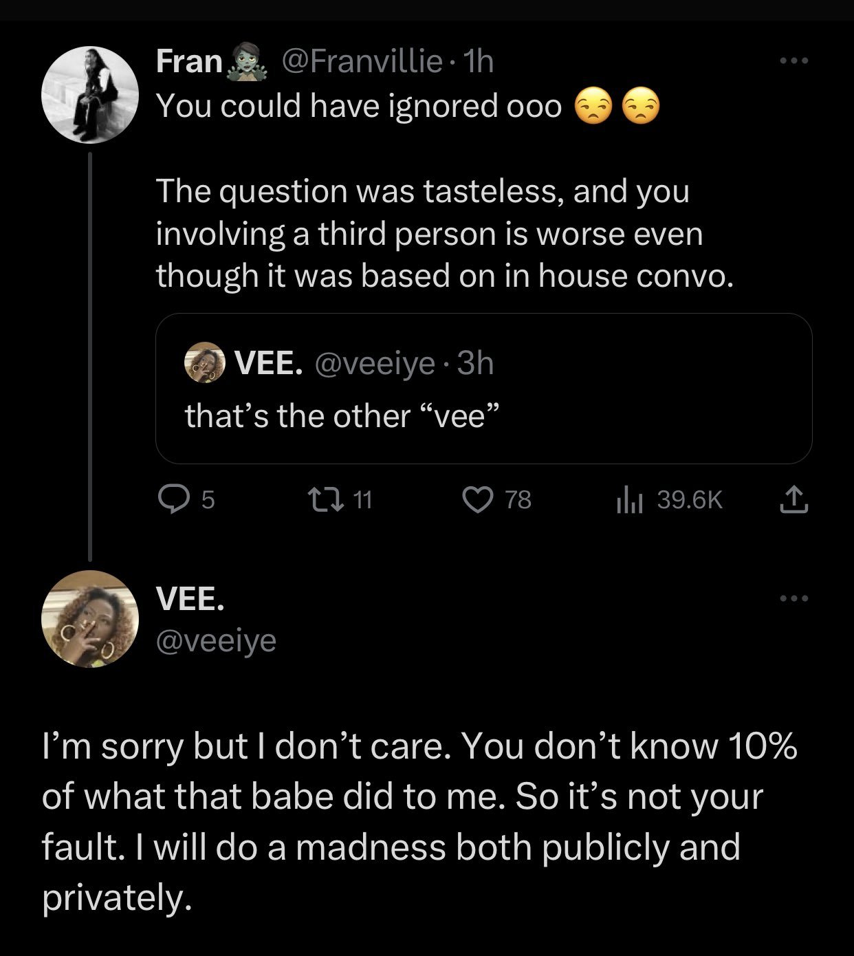 “Dem say you be olosho wey dem Dey hire for different events,” the user tweeted. Vee responded making it understandable that Ike wasn’t talking about her own Vee but Venita, “that’s the other “vee”, she tweeted.