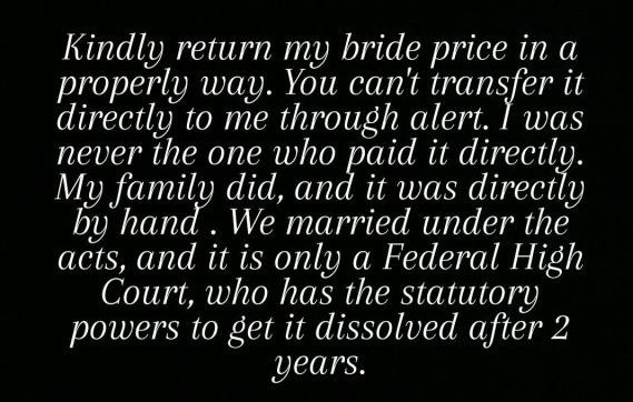 The situation remains unresolved as Israel continues to seek the proper dissolution of their marriage and the return of the bride price.