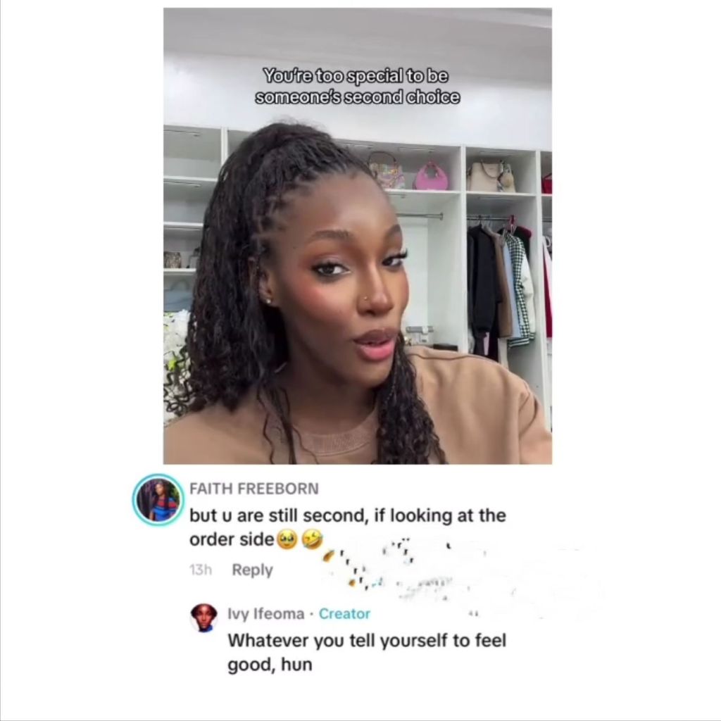 The incident unfolded on Ifeoma’s TikTok page, where she had shared a video of herself singing along to background music. In the video’s caption, Ifeoma offered a piece of advice to her followers, stating, “You’re too special to be someone’s second choice.”