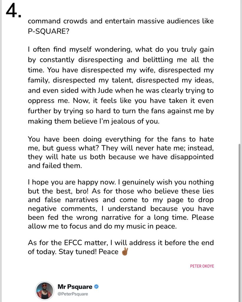 In his Instagram note, Peter expressed shock after watching Paul’s interview where Paul claimed to have been petitioned. Peter stressed that any EFCC action was directed towards Jude and not Paul.