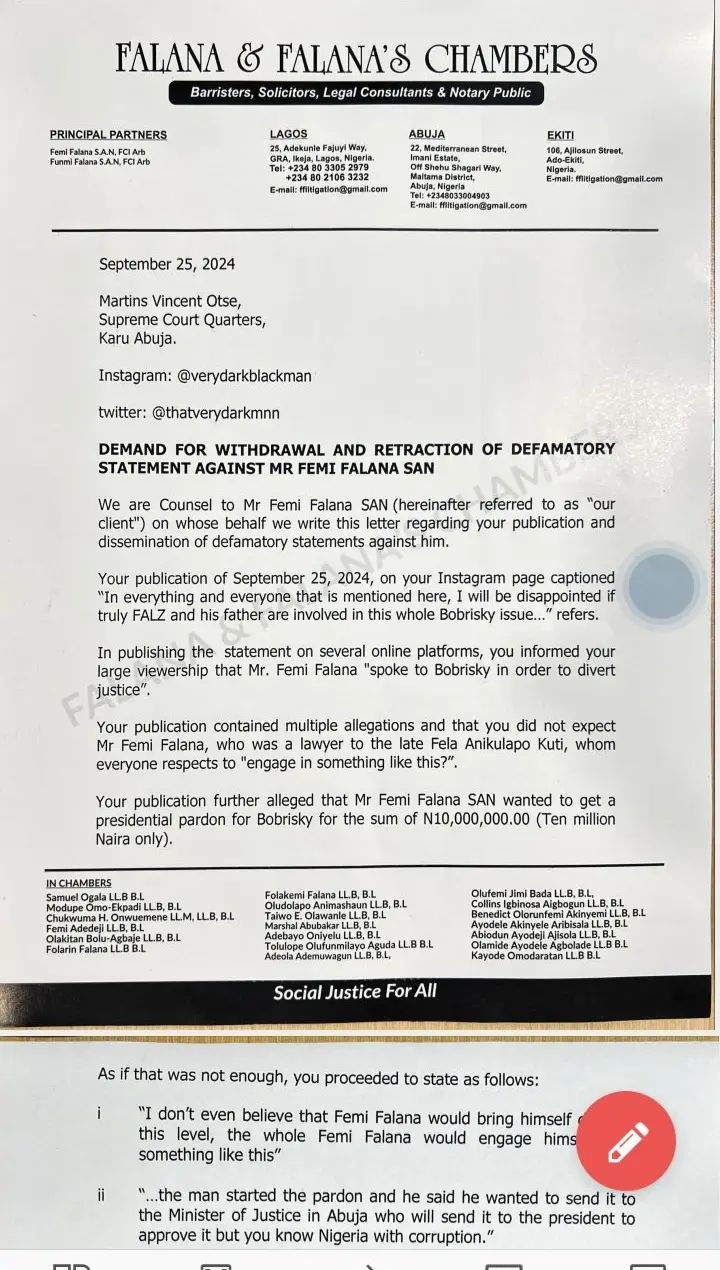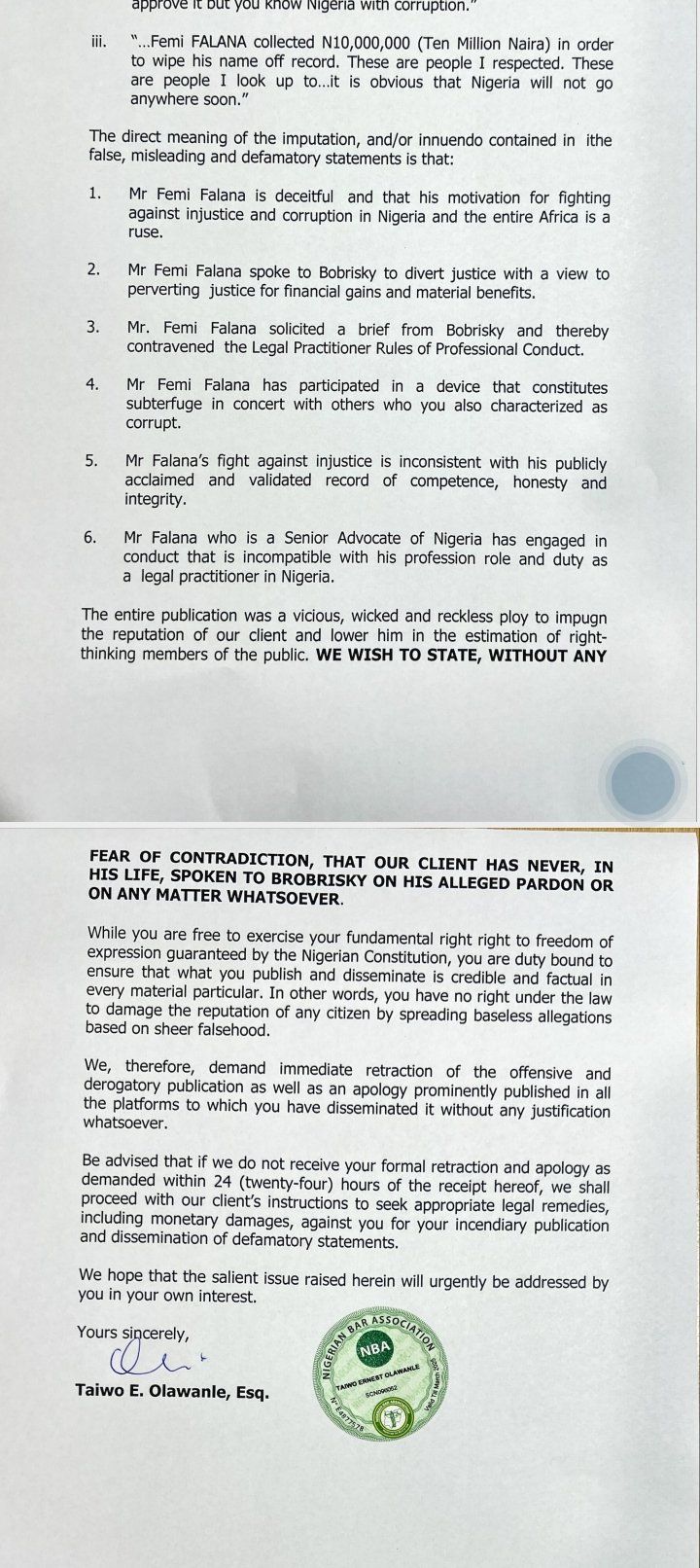 - – Falana’s legal team demands a public apology and retraction from Otse within 24 hours, warning of potential legal action for defamation if not met.