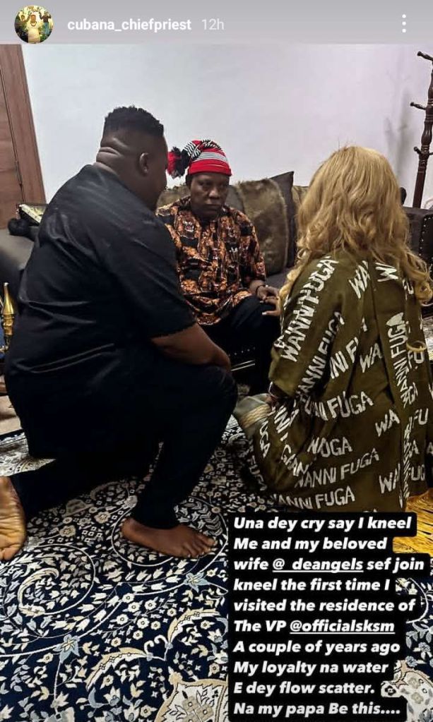 In a strong response to critics, Cubana Chief Priest, whose real name is Pascal Chibuike Okechukwu, posted a throwback photo. In the image, he and his wife are both seen kneeling before Vice President Shettima during an earlier visit.