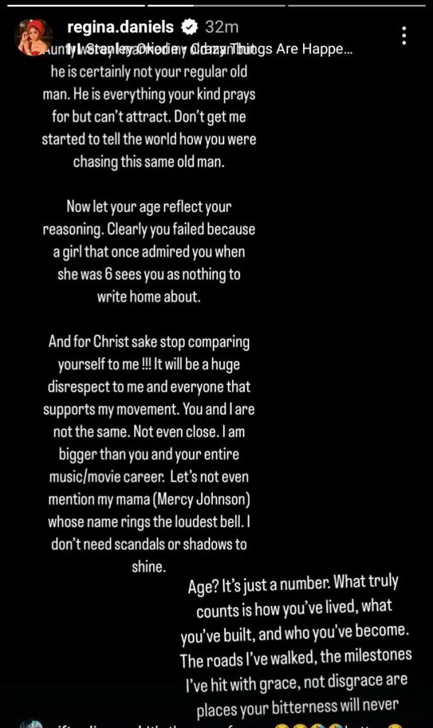 Regina Daniels did not like Angela’s comments and jumped in to defend Mercy Johnson. She made strong statements that quickly turned the situation into a full-blown war of words.