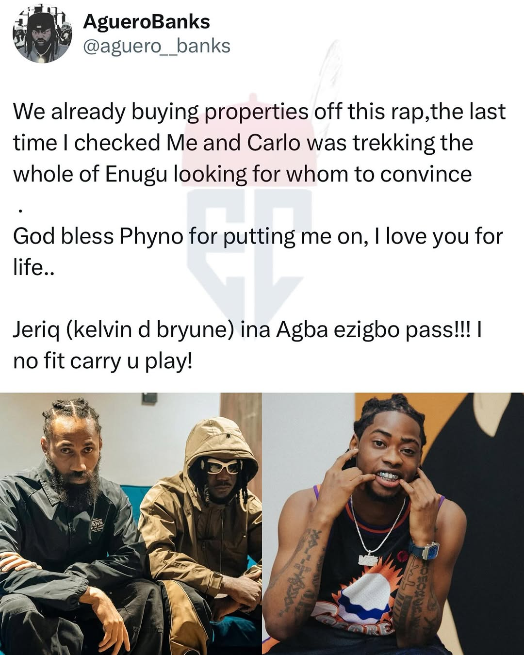 In the same post, Aguero also gave a big shout-out to fellow rapper Jeriq. He thanked him for being the link between him and Phyno.
