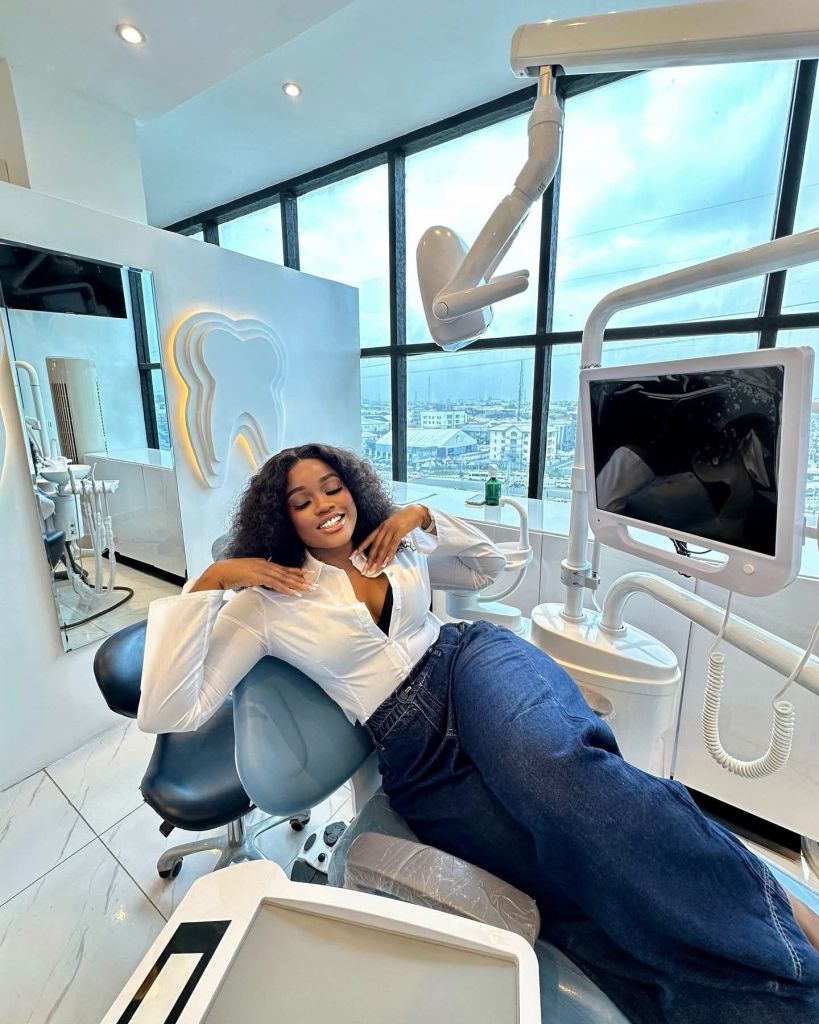 Sharing stunning photos on her social media, Cee C was seen reclining confidently in a dentist’s chair, dressed in a crisp white blouse and high-waisted denim. Her smile lit up the clinic space, which featured a modern design and large glass windows with a city view.