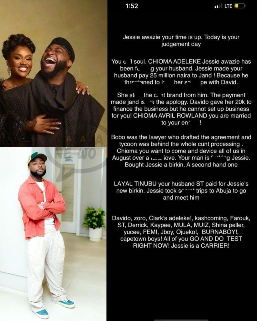 The leaked texts also accused Davido of buying Jessie a Birkin bag. Another shocking claim alleged that Chioma Avril Rowland, Davido’s wife, was dragged into the scandal through threats and blackmail.